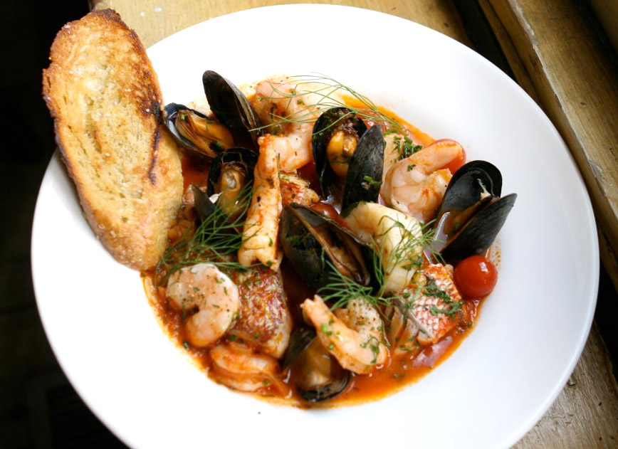 The unique flavor of this dish is given not only by the variety of fish and shellfish (after all, all fish stews and soups have fish), but by the other ingredients that are added to the stew: leeks, onions, garlic, fennel seeds, celery, saffron. All of them compliment the flavors in bouillabaisse beautifully. It’s traditionally served atop slices of French bread, that is seasoned with a spicy sauce made of chilies and olive oil (rouille).