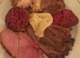 At the moment of serving, drain the meat from the broth, cut it into slices or pieces, arrange them on a serving dish and serve with the hot sauce.